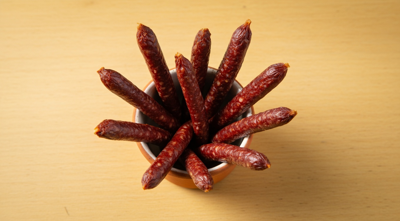 Българска луканка на пръчици — солена, пикантна, много питейнаBulgarian lukanka on sticks — salty, spicy, goes great with a drink
